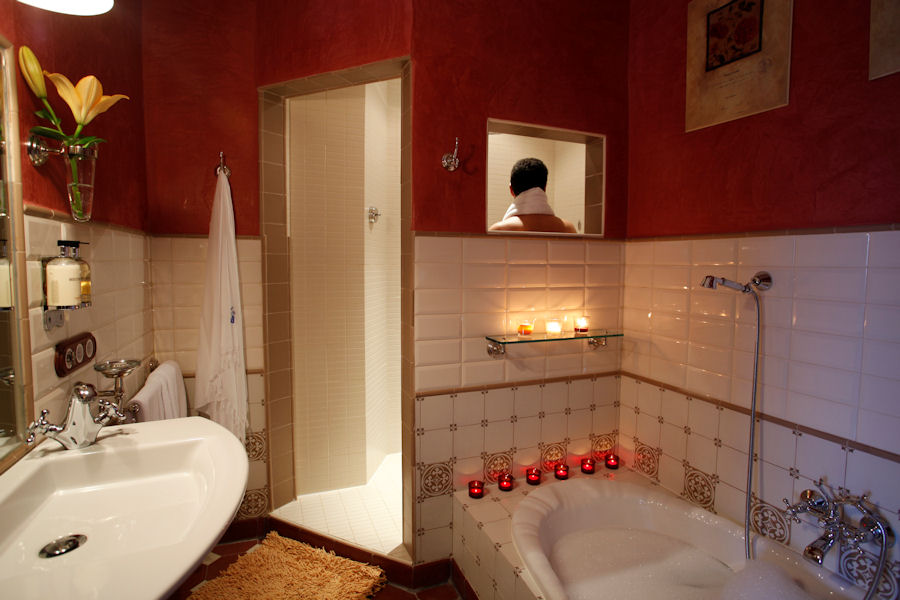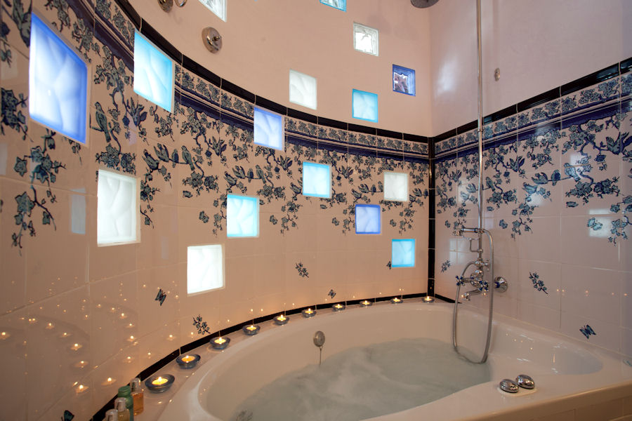 Our poets' retreat: this romantic suite has a special character all of its own. The blue and azure hues of the glass tiles in the curved wall filter gentle light, casting an enchanting glow over the entire suite.