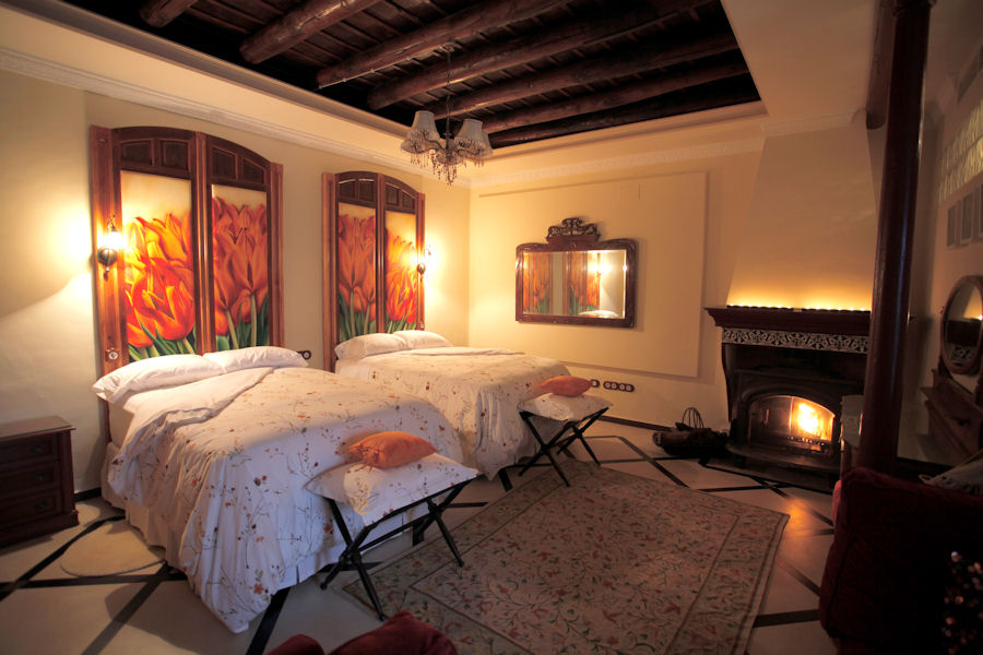The antique fireplace and original exposed beams of the ceiling reflect the ochre hues of the paintings and enhance the embracing warmth and luxury of this suite.