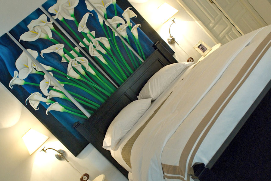 Awash in tones of blue - the midnight and cream furnishings, the dramatic lilies cascading over the bed and the diaphanous linen drapes fuse to create the perfect atmosphere for your daytime reverie.